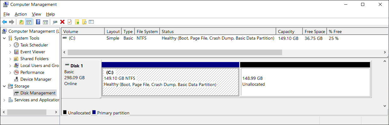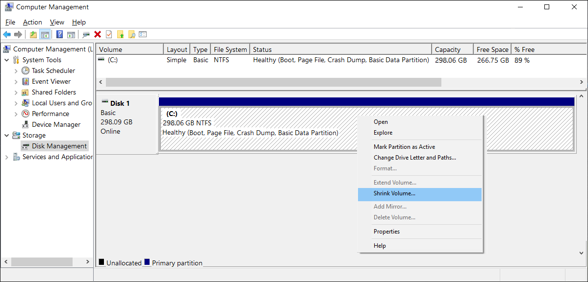 Shrinking the C: Drive for Dual BootingIf you decide to try using a Dual Boot setup on this device, mainly for communicating via the Internet with a more recent OS (such as Linux Mint) without the OS attempting to or even downloading any kind of Microsoft updates,[1] then you can use Windows built-in Shrink function to make room for a second OS partition. This will make it possible for you to still use the four SATA ports under the ICS control software that currently will only run under a Windows 64-bit OS. Otherwise, using the whole storage drive for a Linux OS would be recommended. Here are some screenshots of shrinking the C: Drive under the Windows OSs Disk Management tool:   You should see something similar to this after the SHRINK process has completed: Some Quirks and Inconveniences of Dual Booting the Solo-4 G3Since the H87N motherboard can boot either an older MBR scheme OS or a newer UEFI capable OS and the Solo-4 G3 Restore USB drive installs the Windows Embedded OS under the MBR scheme, you need to make sure that any other OS, such as Linux Mint, does not install under UEFI mode! If it does, you will never be able to get the Windows OS onto the linux grub boot menu! It would only be able to do so if the Windows OS had been installed on a GPT formatted disk and the OS could boot in UEFI mode! So, never allow a second OS (whether a Linux or even another Windows OS) to install an EFI/UEFI boot partition! It must also be noted: So far, every time I have booted into the Linux OS below and then have gone back into the Windows Embedded OS, none of the USB devices (including