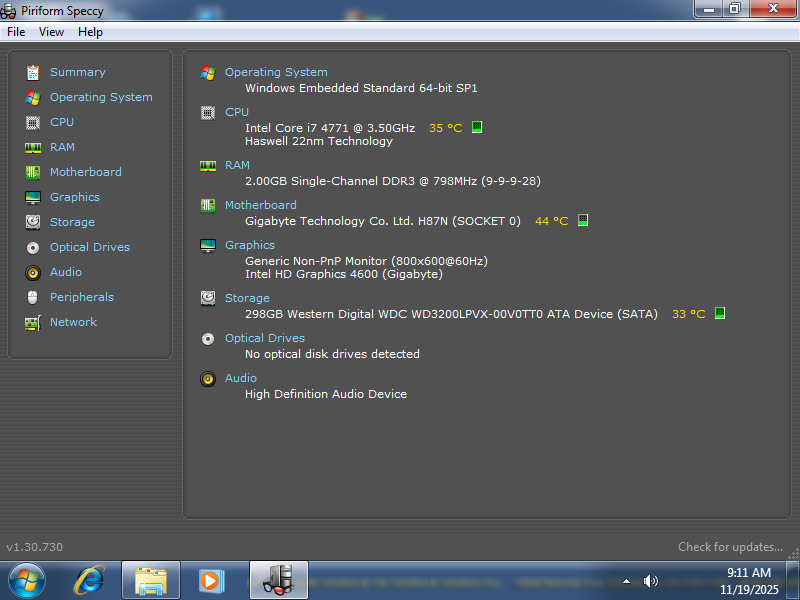 From the above, you can see that I had added some utility programs, such as Speccy and also Process Explorer to my unit. The basic Specs as seen in the Properties window are: 1) OS: Windows Embedded Standard (2010), Service Pack 1, 64-bit, 2) CPU: Intel® Core™ i7-4771 (3.50 GHz), with Speccy adding that this is a "Haswell 22nm Technology" chip, 3) RAM: 2.00 GB (1.87 GB usable); Speccy adding the Memory is type DDR3, and 4) Motherboard: Gigabyte H87N (WiFi is not included on this board); if you search for GA-H87N, you can find a User Manual for this board. For other Specs, click on the pictures above.